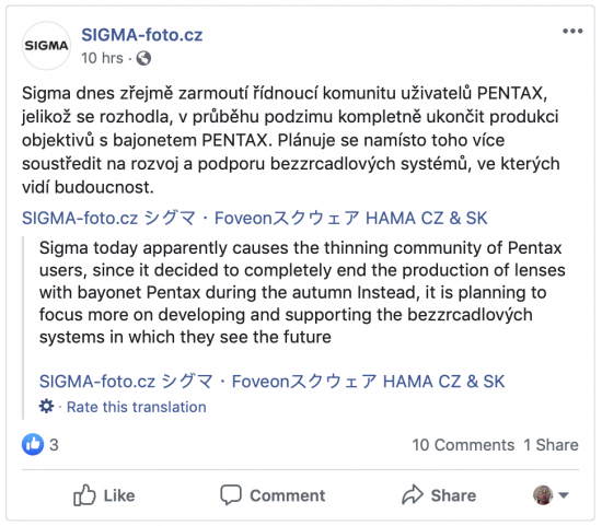 The announcement was made on the Facebook page of Sigma Czech Republic, stating that because of dwindling numbers of Pentax users and company has decided to stop producing Pentax mount lenses.