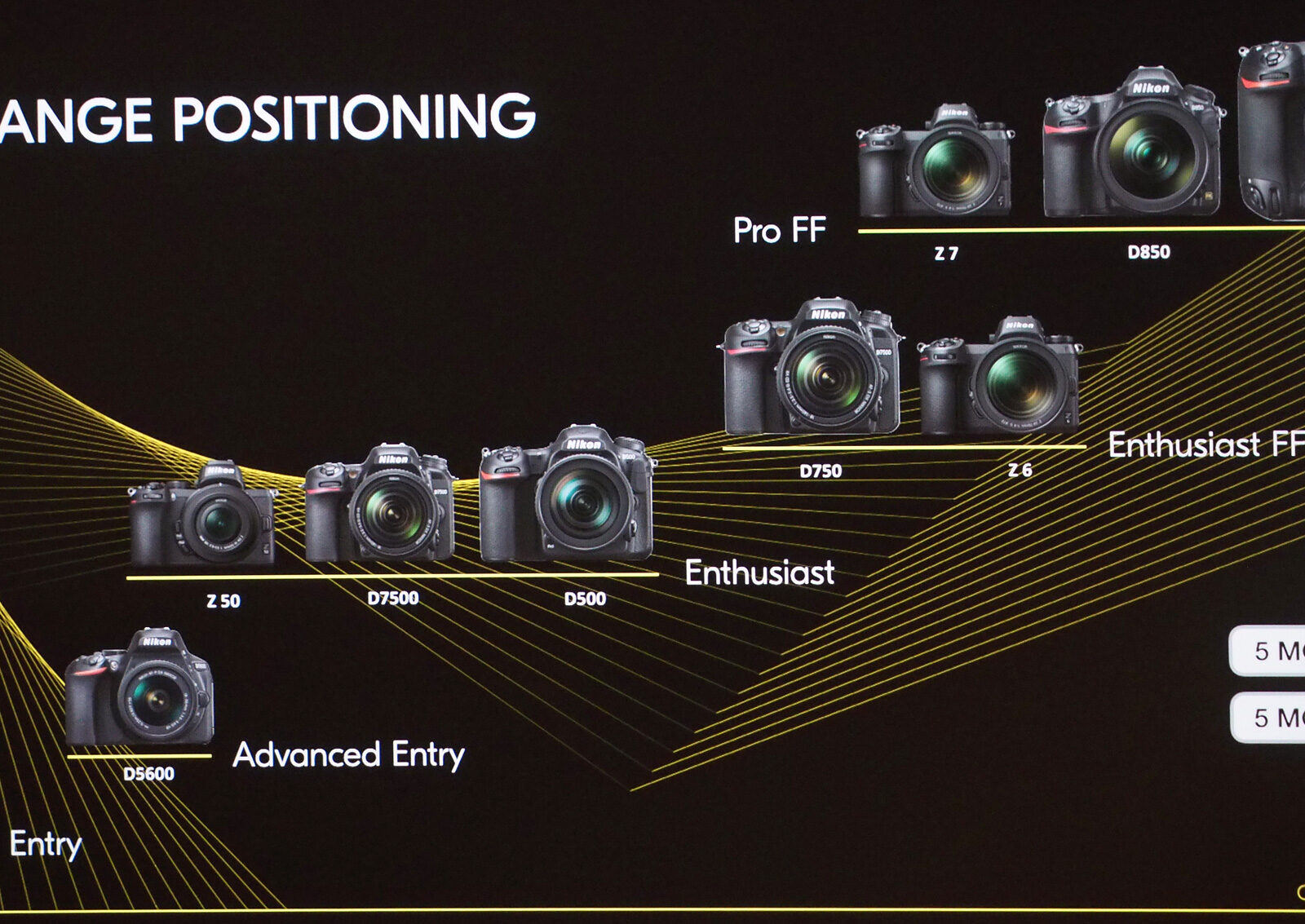 Nikon posted current camera range positioning of 2019 during the launch event of Nikon Z 50 (Amazon, B&H, Adorama) APS-C Z-mount mirrorless camera. There are currently 10 Nikon interchangeable lens cameras on the market. 3 are mirrorless and 7 are digital SLRs. In addition, 5 of these Nikon cameras are offered as full-frame sensor, FX and 5 as APS-c sensor, DX. Looking at the list below, we can see how and where Nikon positioned its products.