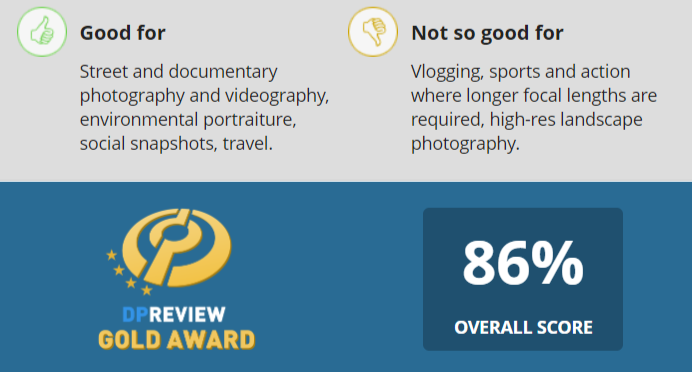 DPReview has published the Fujifilm X100V full in-depth review and test results: The Fujifilm X100V compact camera achieved an amazing 86% overall score and Gold Award from the experts at DPReview.