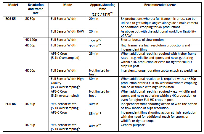 Canon has released an additional press release to detail the video recording times possible with the EOS R5 and EOS R6 cameras and whether there are any limits due to overheating.