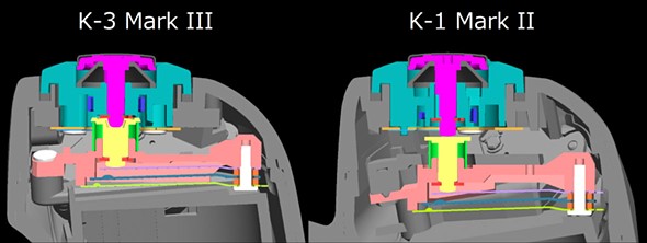 The K-3 Mark III includes a new shutter release mechanism, as shown here compared to the mechanism in the K-1 Mark II. Compared to the K-3 Mark II, the new K-3 series camera’s shutter release will offer users ‘lighter’ and ‘smoother’ action.