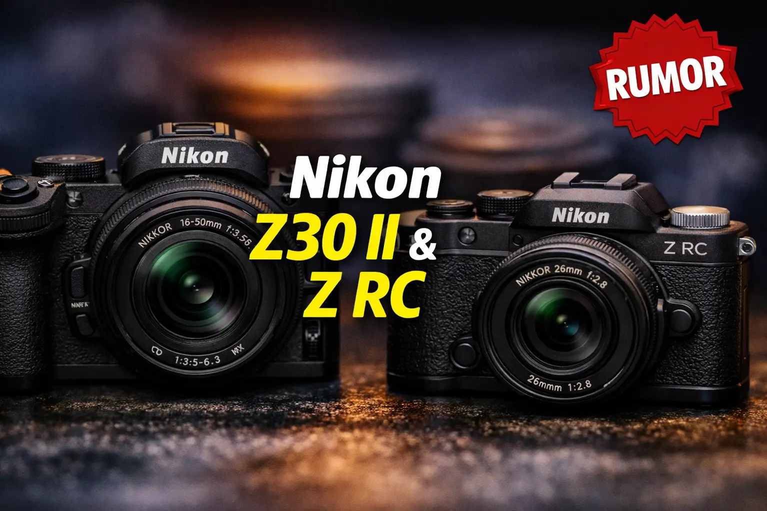 - Nikon Z RC / Z30 II Video Variant — Compact APS-C body, EVF-less, designed for vloggers. Rumored specs: 20.9MP DX sensor, EXPEED 7, 4K60p 10-bit N-Log, tally lamps, AI AF. Price target ~$649–$799.