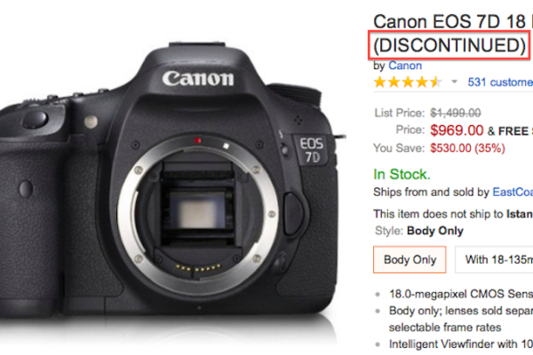 Canon EOS 7D digital SLR camera is now listed as “discontinued” at Amazon. You can still get the camera from other retailers through Amazon. As expected Canon is rumored to announce...